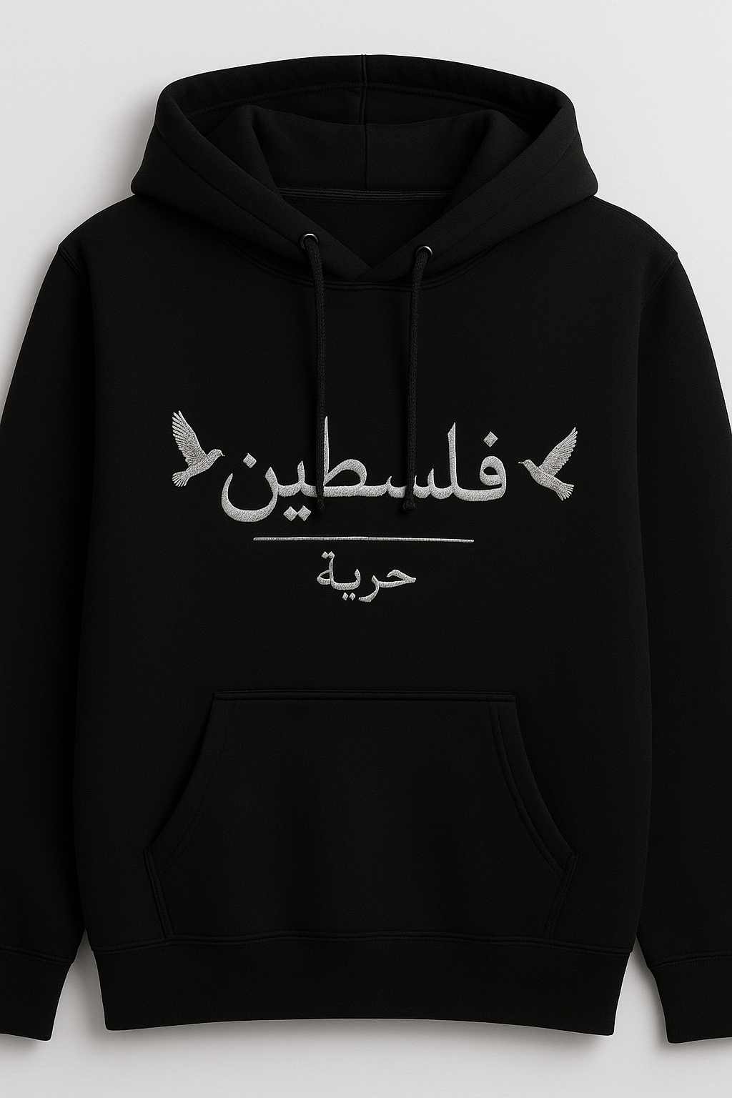 The Arabic word “فلسطين” (Palestine) is embroidered in bold silver thread, representing resilience through pain, and dignity that never fades.